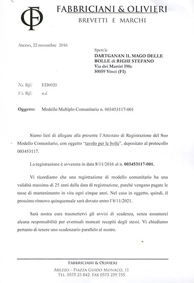 D'ARTAGNAN IL MAGO DELLE BOLLE ha registrato e brevettato a livello europeo un piano di lavoro doppio per bolle di sapone, grazie al quale si possono compiere alcuni effetti non riproducibili altrimenti dagli altri bollisti mondiali.